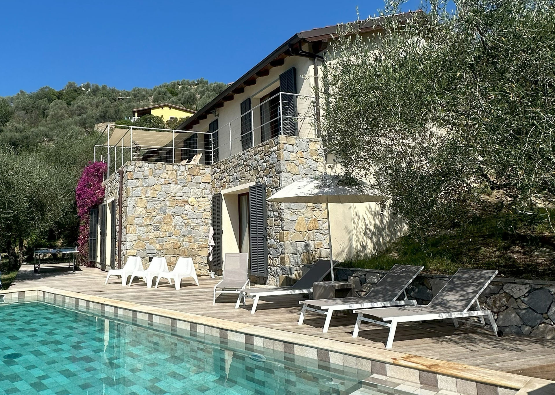 A large family holidayhome on a Hill… Concealed within an ancient olive grove, offering a magnificent “bella vista” view of the valley along the Nervia River, you will discover our enchanting destination. Just a 15-minute drive from the Mediterranean Sea and the renowned Italian Riviera dei Fiori, our idyllic sanctuary awaits you amidst the splendor of the surrounding landscape. Built in 2008, the primary goal was to seamlessly integrate the house with the natural environment.